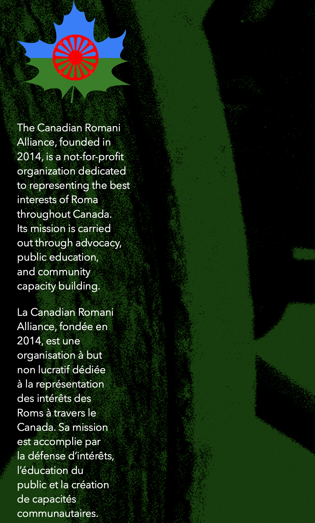 The Canadian Romani Alliance, founded in 2014, is a not-for-profit organization dedicated to representing the best interests of Roma throughout Canada. Its mission is carried out through advocacy, public education, and community capacity building.