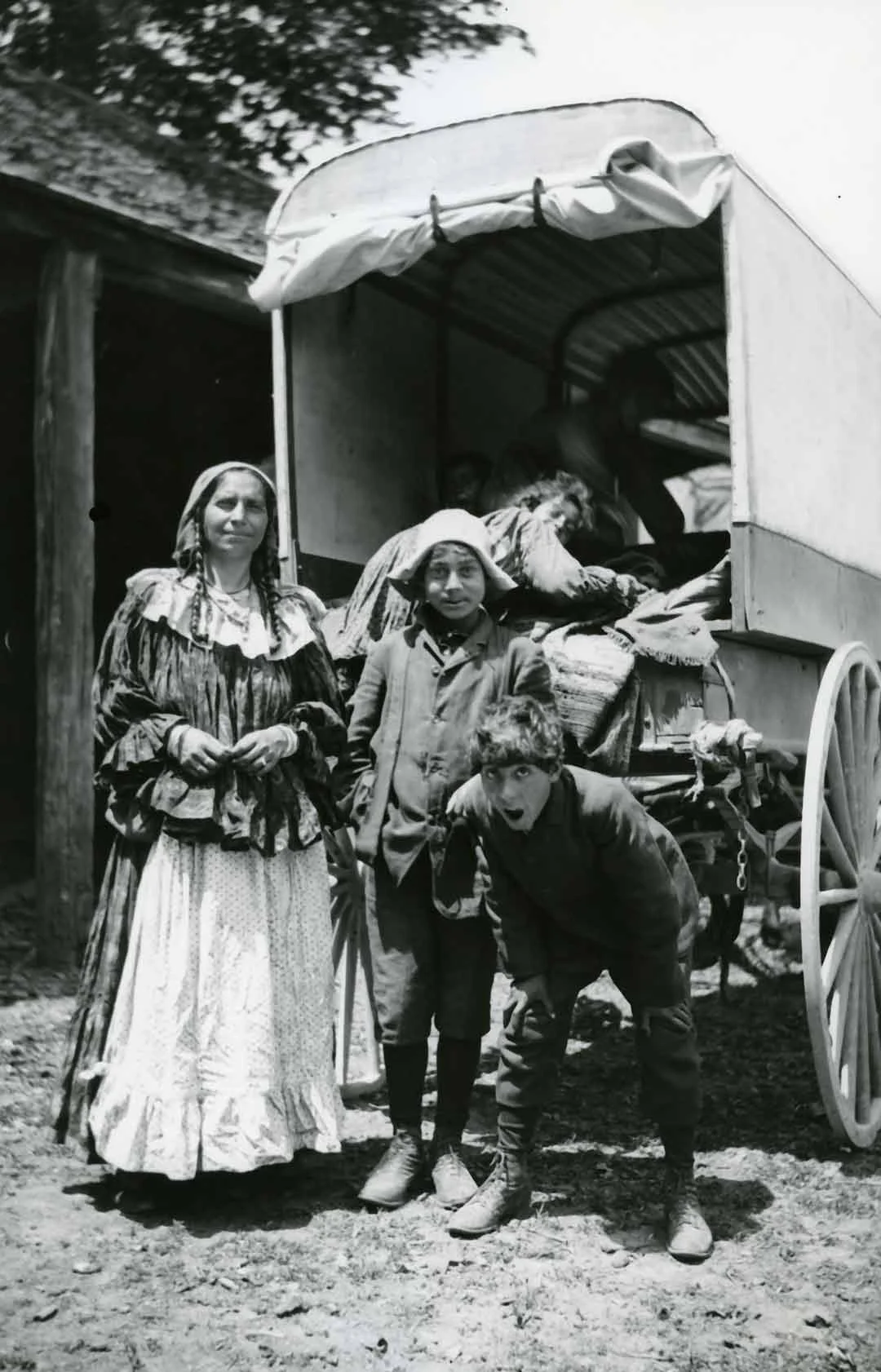 Roma woman and children stand in front of a caravan, Peterborough, Ontario, 1909.